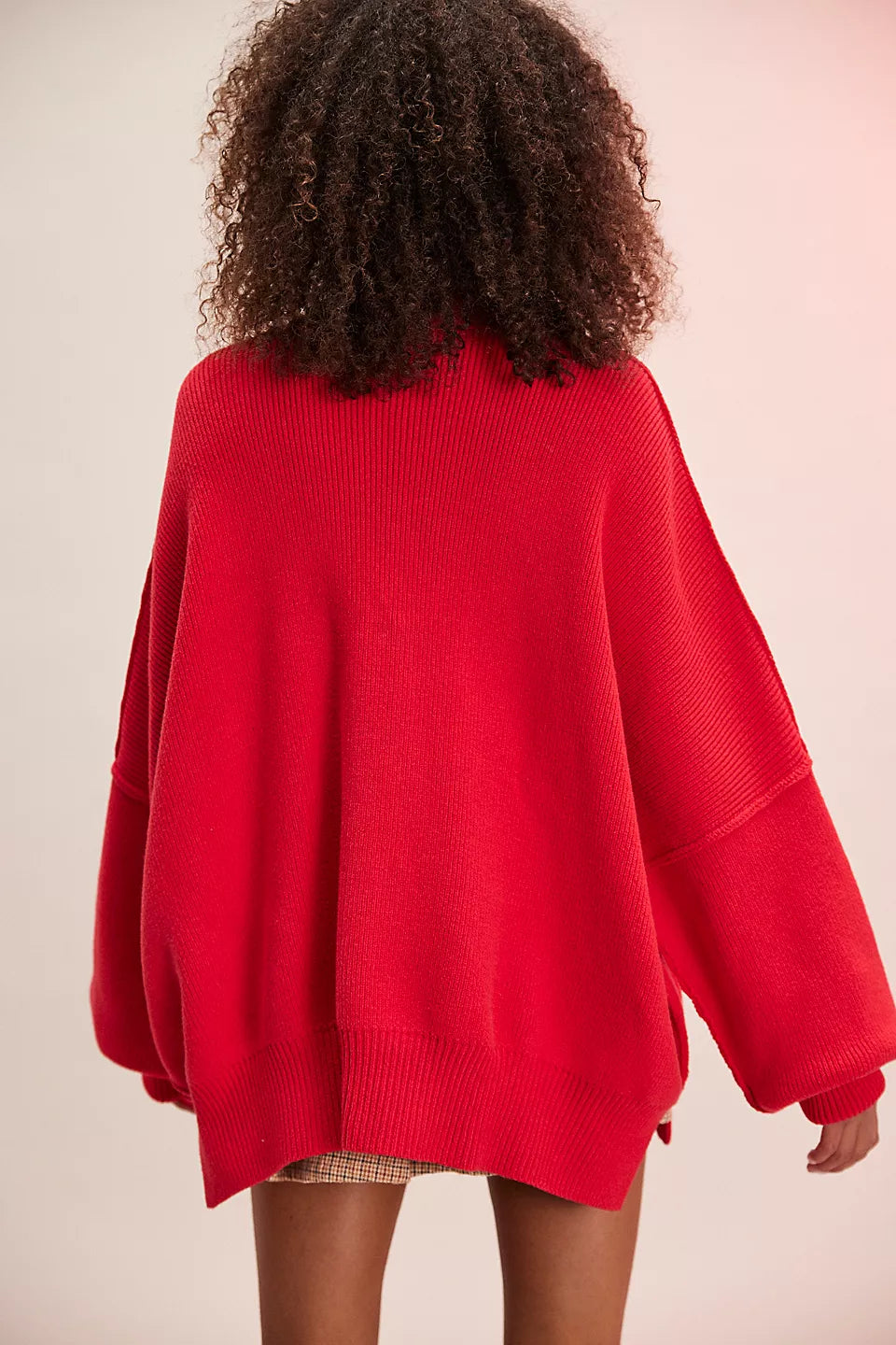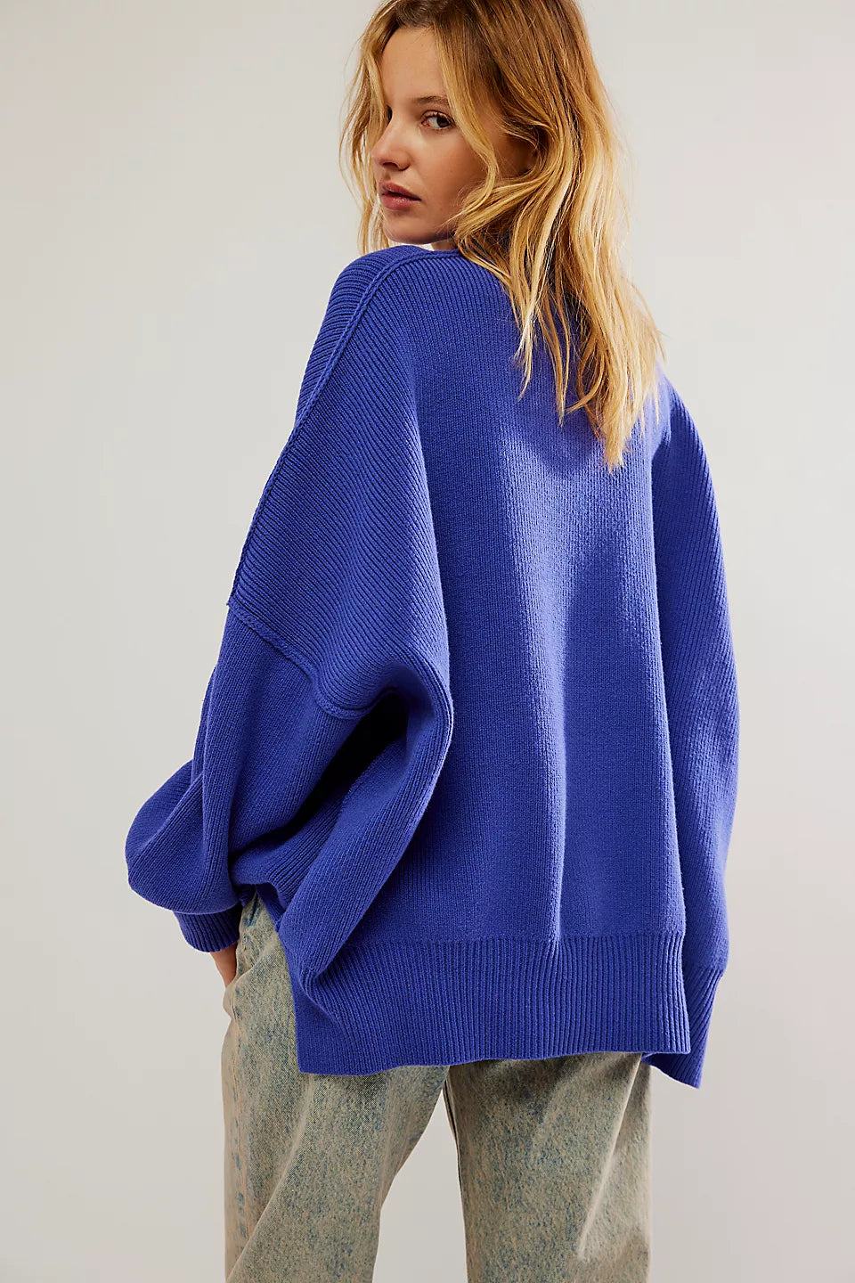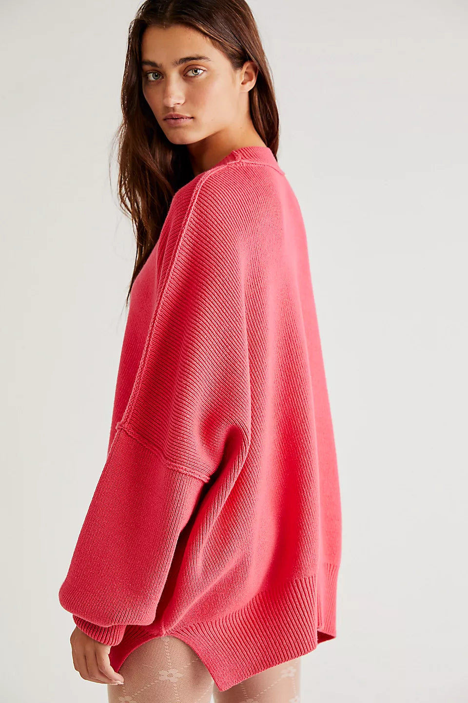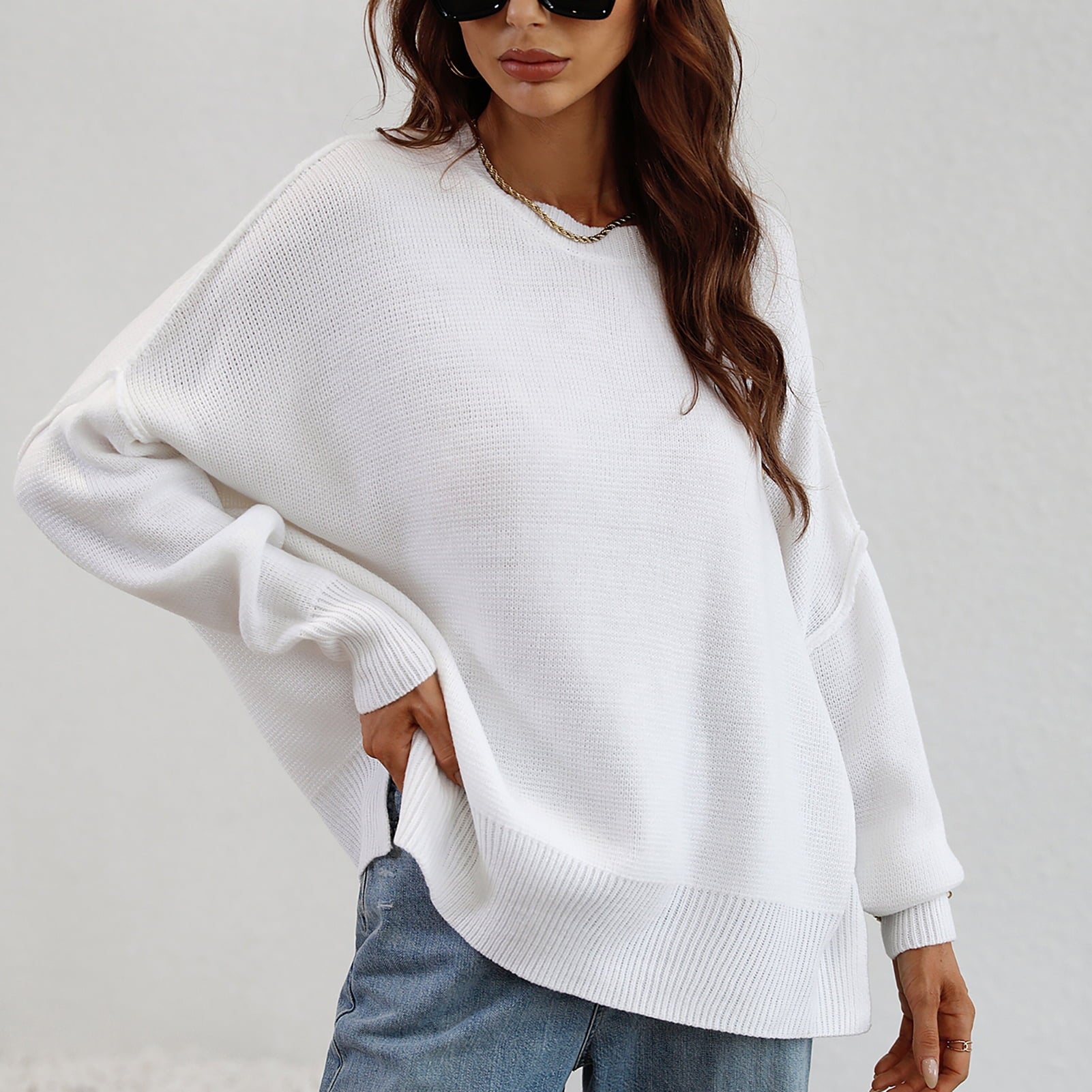 Le pull présenté sur l’image est un modèle oversize, caractérisé par une coupe large et des épaules tombantes. Ce style donne un effet décontracté tout en assurant un confort optimal. Sa longueur descend sous les hanches, ce qui permet de le porter seul comme une robe courte ou avec d'autres vêtements pour un look superposé.