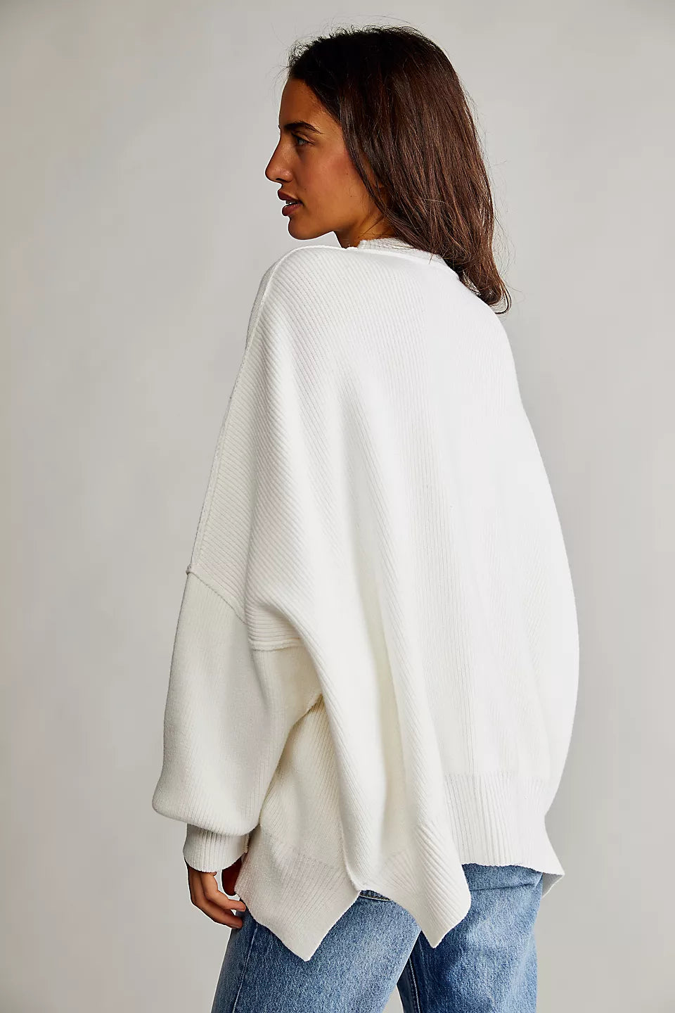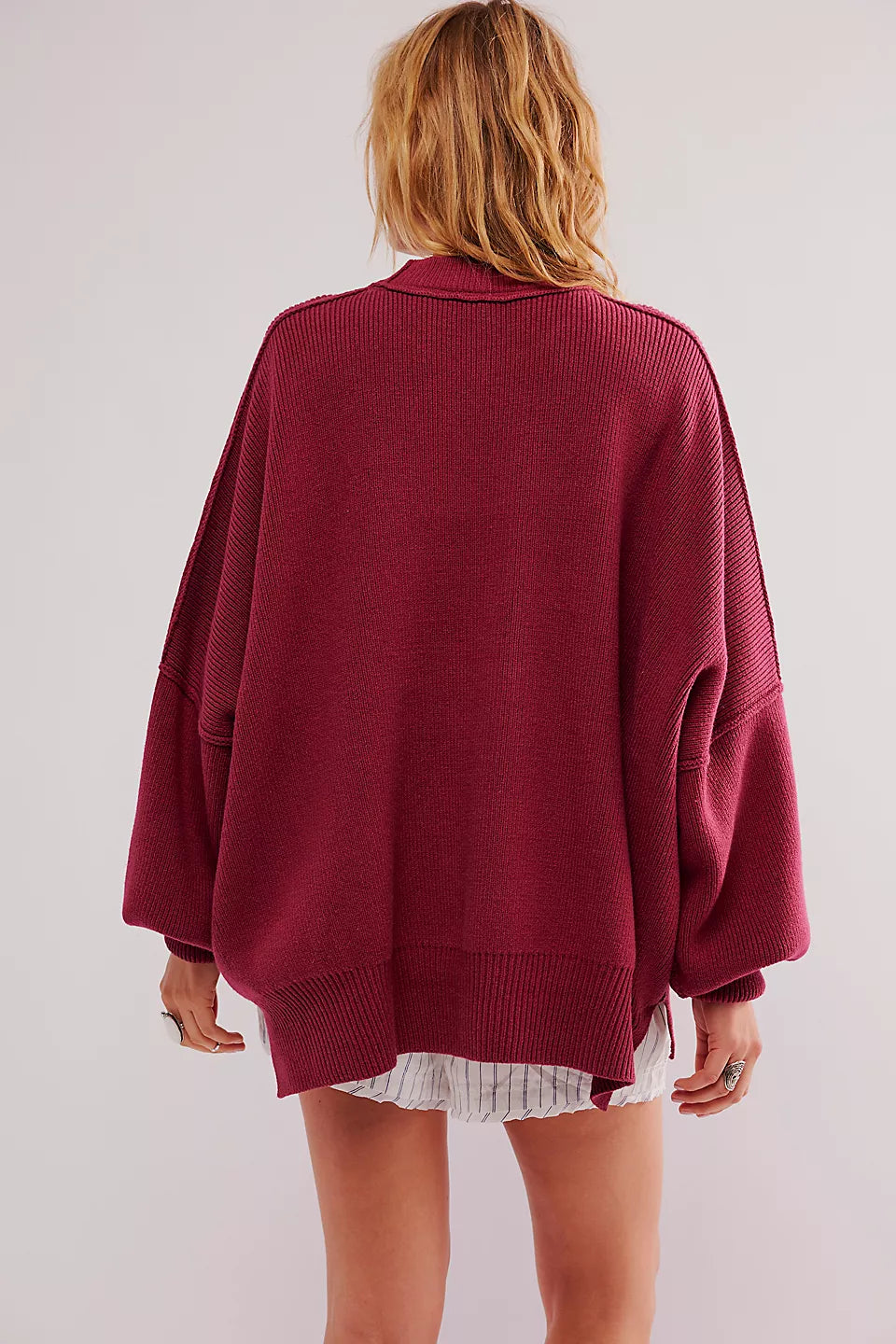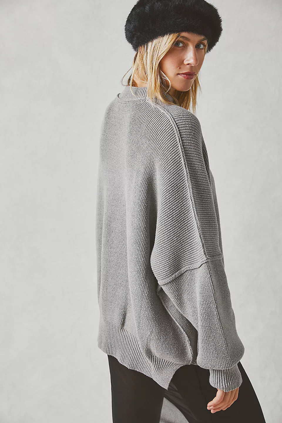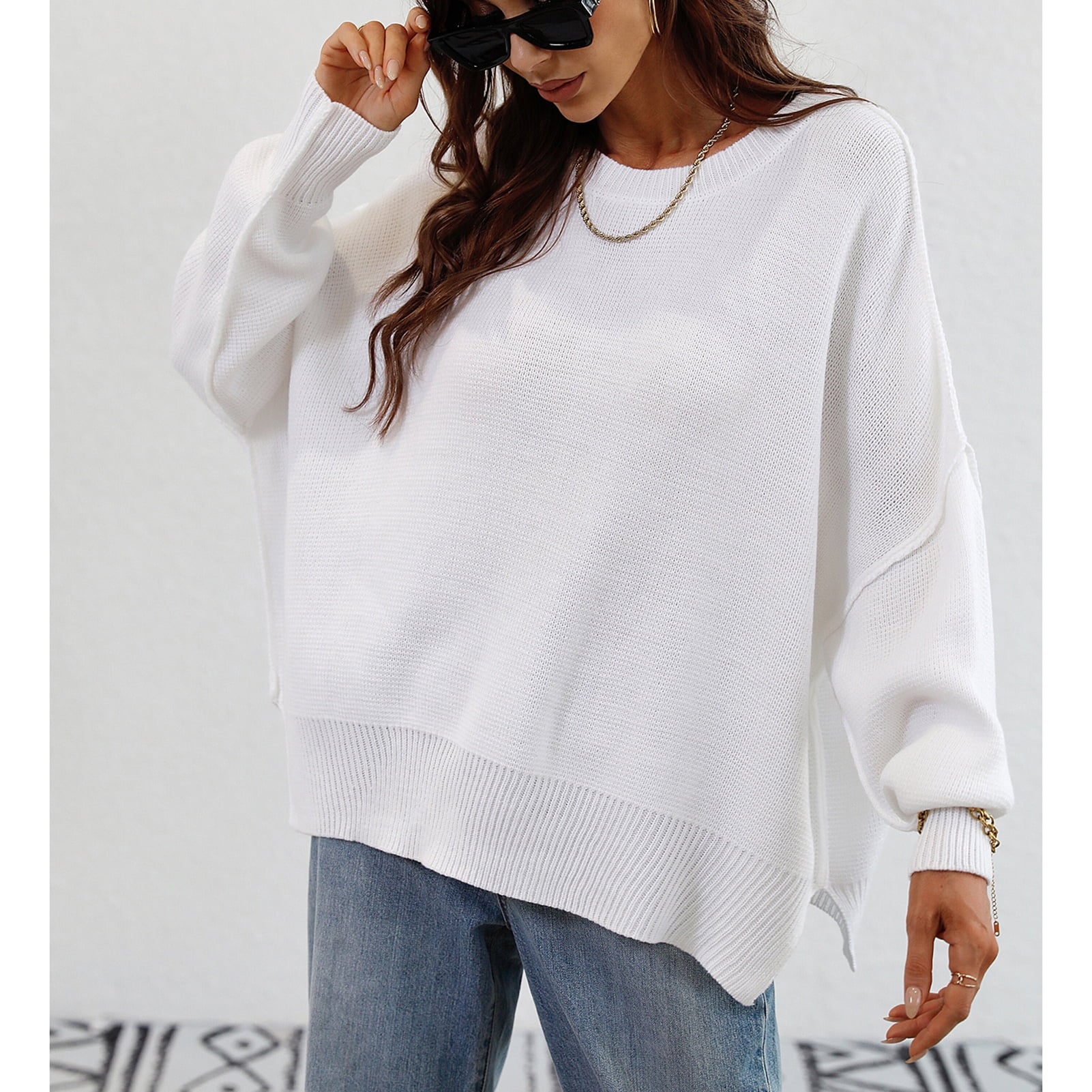 Le pull présenté sur l’image est un modèle oversize, caractérisé par une coupe large et des épaules tombantes. Ce style donne un effet décontracté tout en assurant un confort optimal. Sa longueur descend sous les hanches, ce qui permet de le porter seul comme une robe courte ou avec d'autres vêtements pour un look superposé.