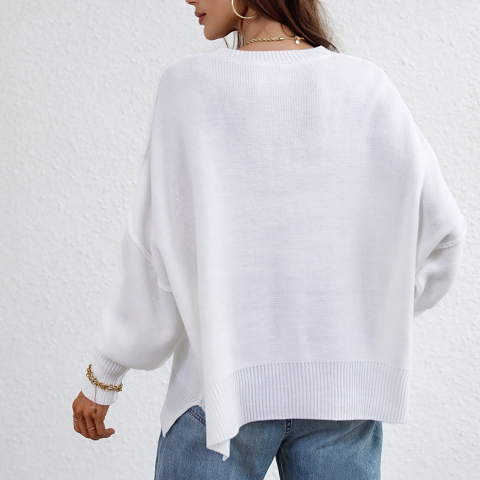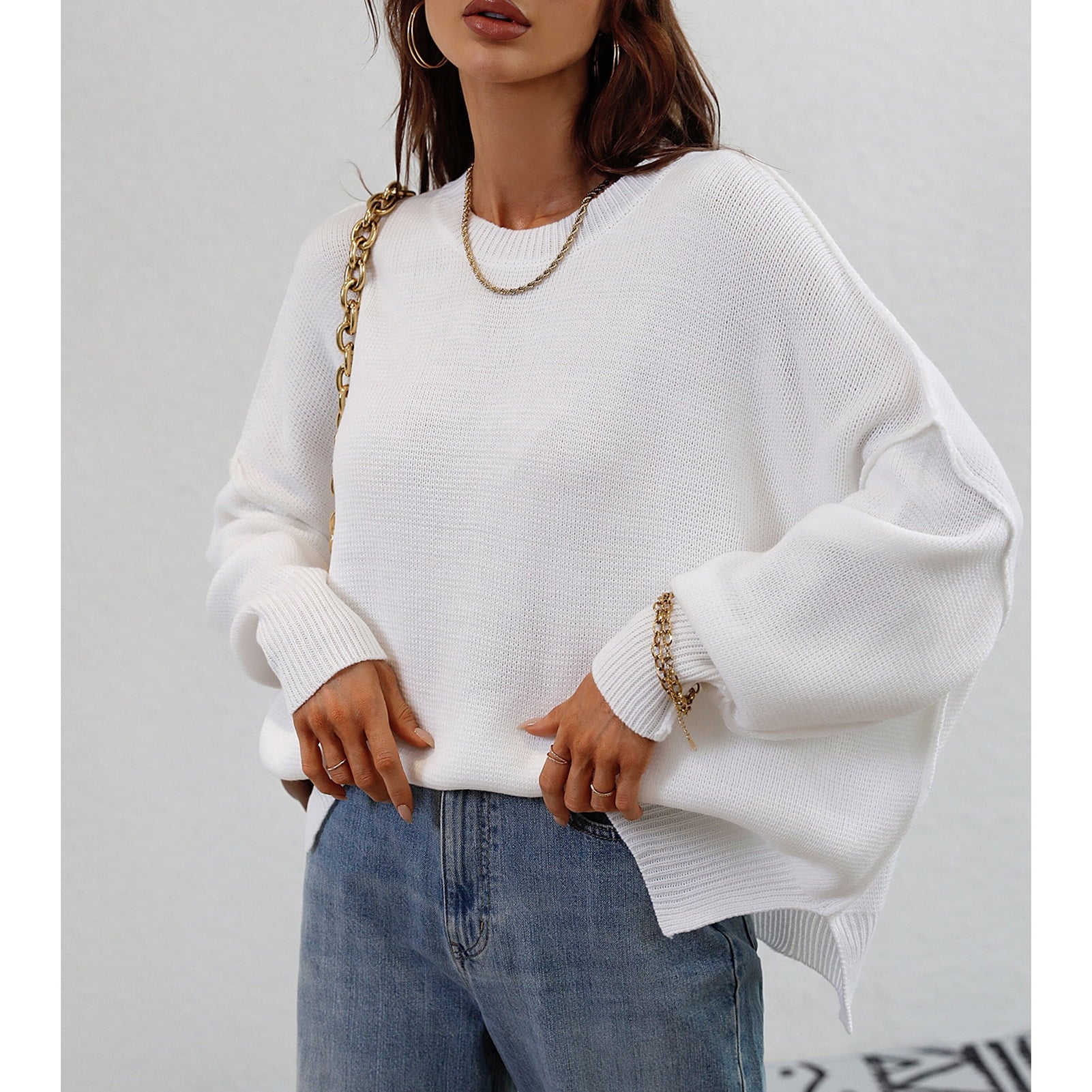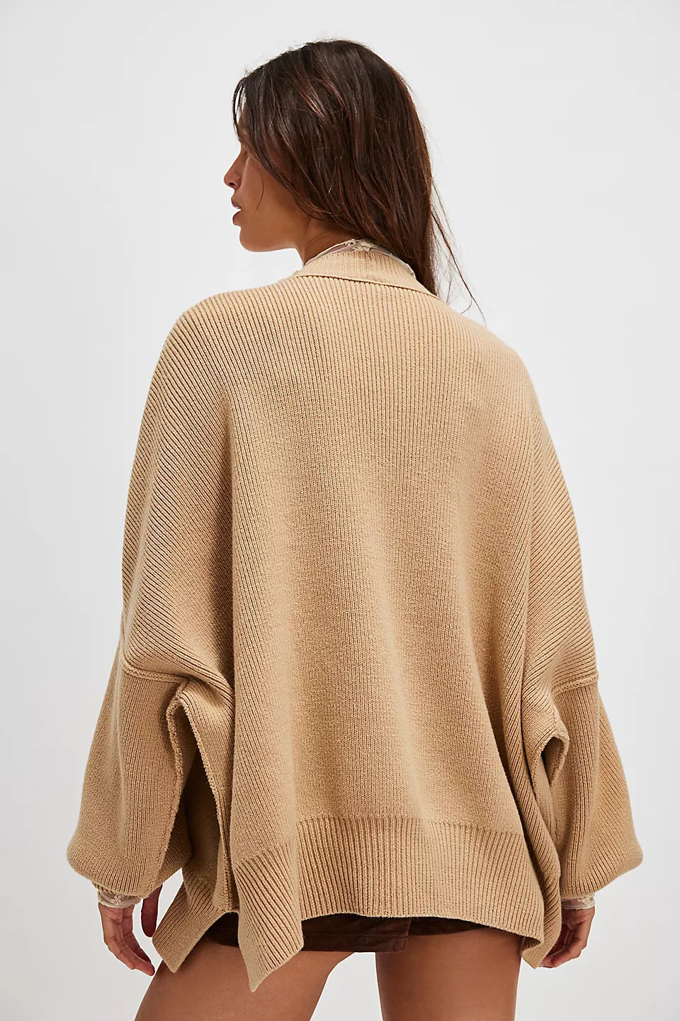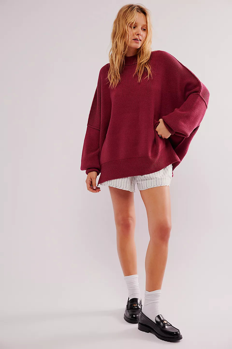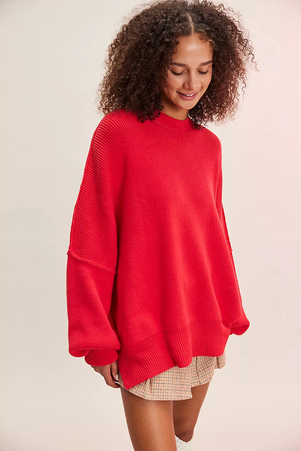 Le pull présenté sur l’image est un modèle oversize, caractérisé par une coupe large et des épaules tombantes. Ce style donne un effet décontracté tout en assurant un confort optimal. Sa longueur descend sous les hanches, ce qui permet de le porter seul comme une robe courte ou avec d'autres vêtements pour un look superposé.