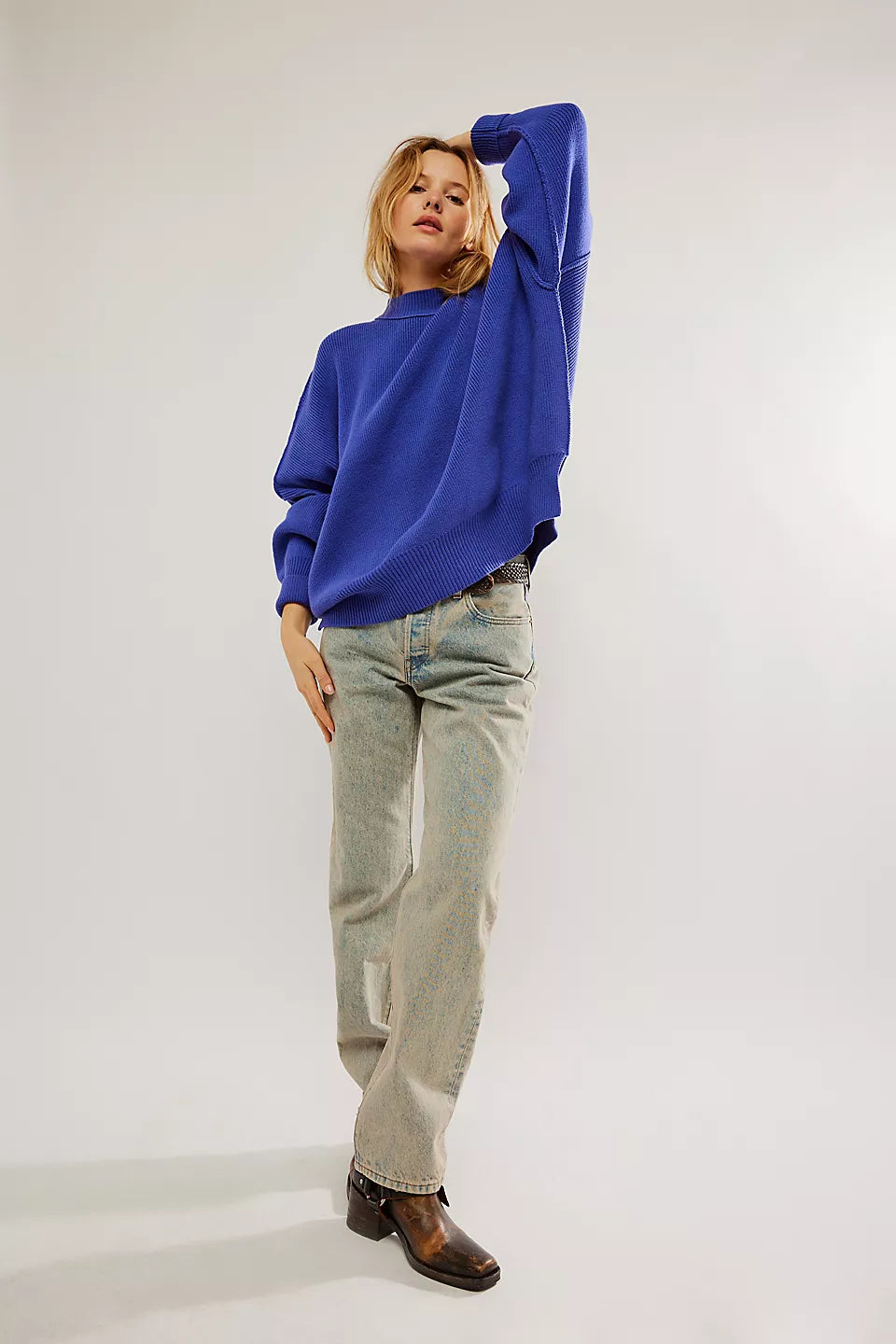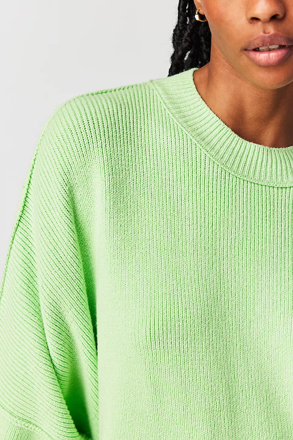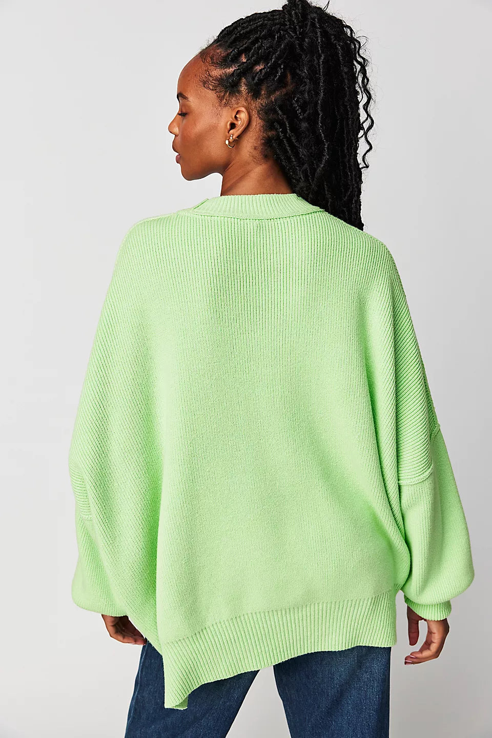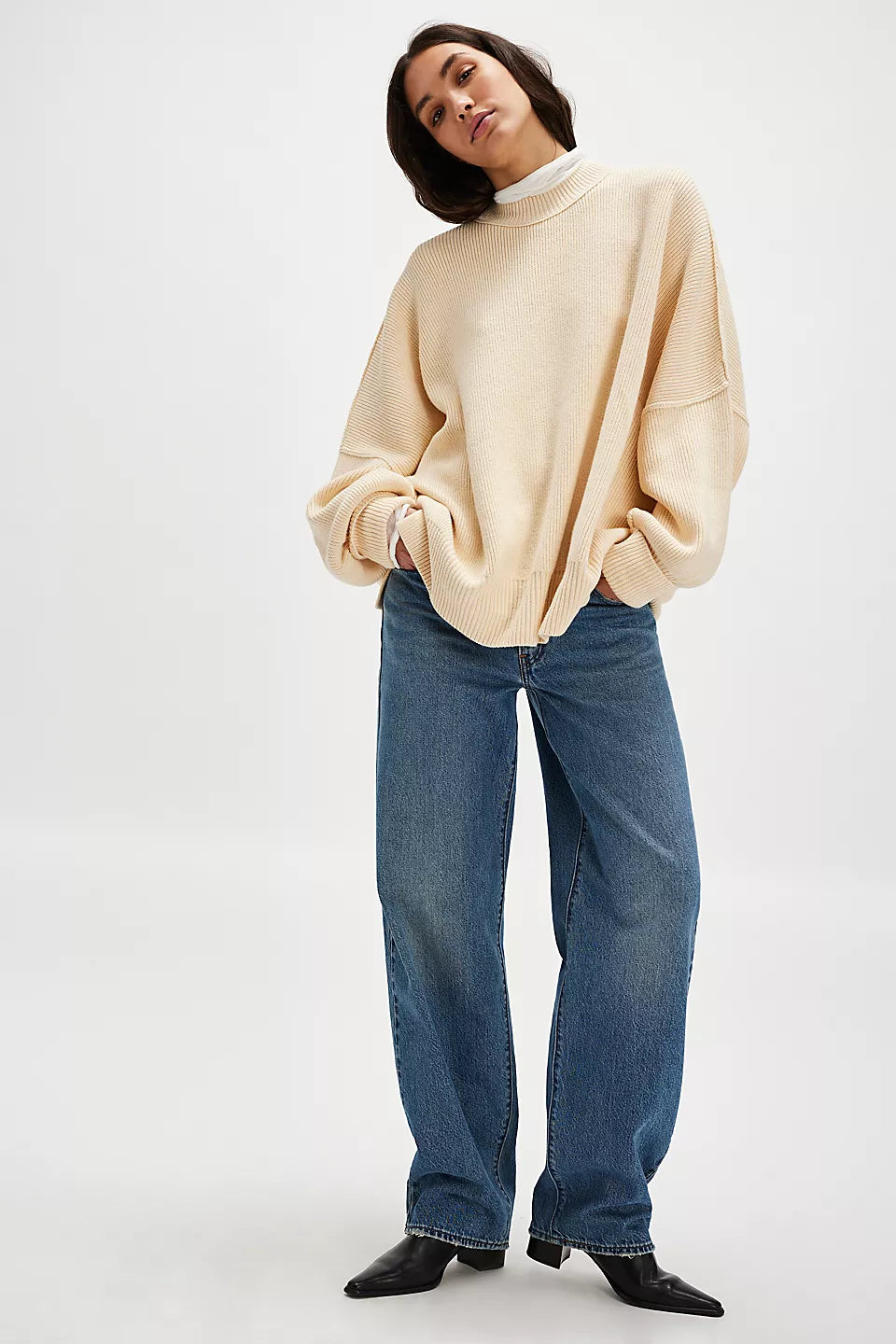 Le pull présenté sur l’image est un modèle oversize, caractérisé par une coupe large et des épaules tombantes. Ce style donne un effet décontracté tout en assurant un confort optimal. Sa longueur descend sous les hanches, ce qui permet de le porter seul comme une robe courte ou avec d'autres vêtements pour un look superposé.
