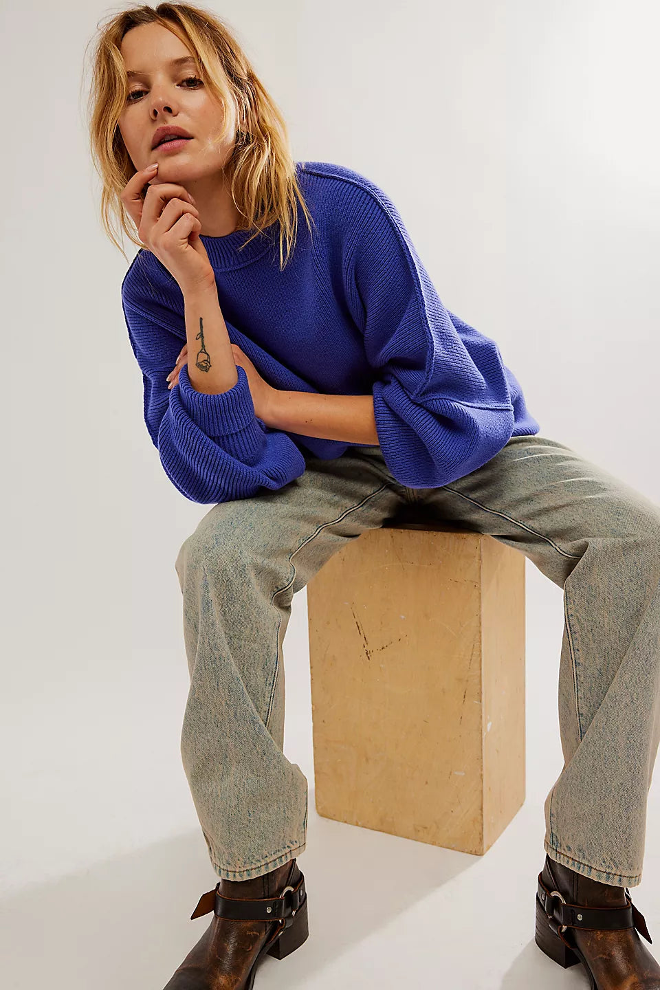 Le tissu du pull semble être en maille épaisse, probablement en laine ou en mélange de fibres synthétiques et naturelles. Ce type de matière garantit une bonne isolation thermique tout en restant respirant. Les manches longues et légèrement bouffantes renforcent l’aspect cocooning du vêtement, parfait pour les saisons froides.