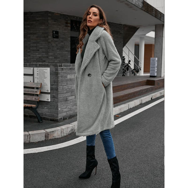This long coat is both elegant and cozy, perfect for facing cold days in style. Its loose fit envelops the body in a feeling of warmth and softness, while its wide, structured collar adds a sophisticated touch. The clean design, enhanced by two discreet buttons, makes it easy to wear and match.