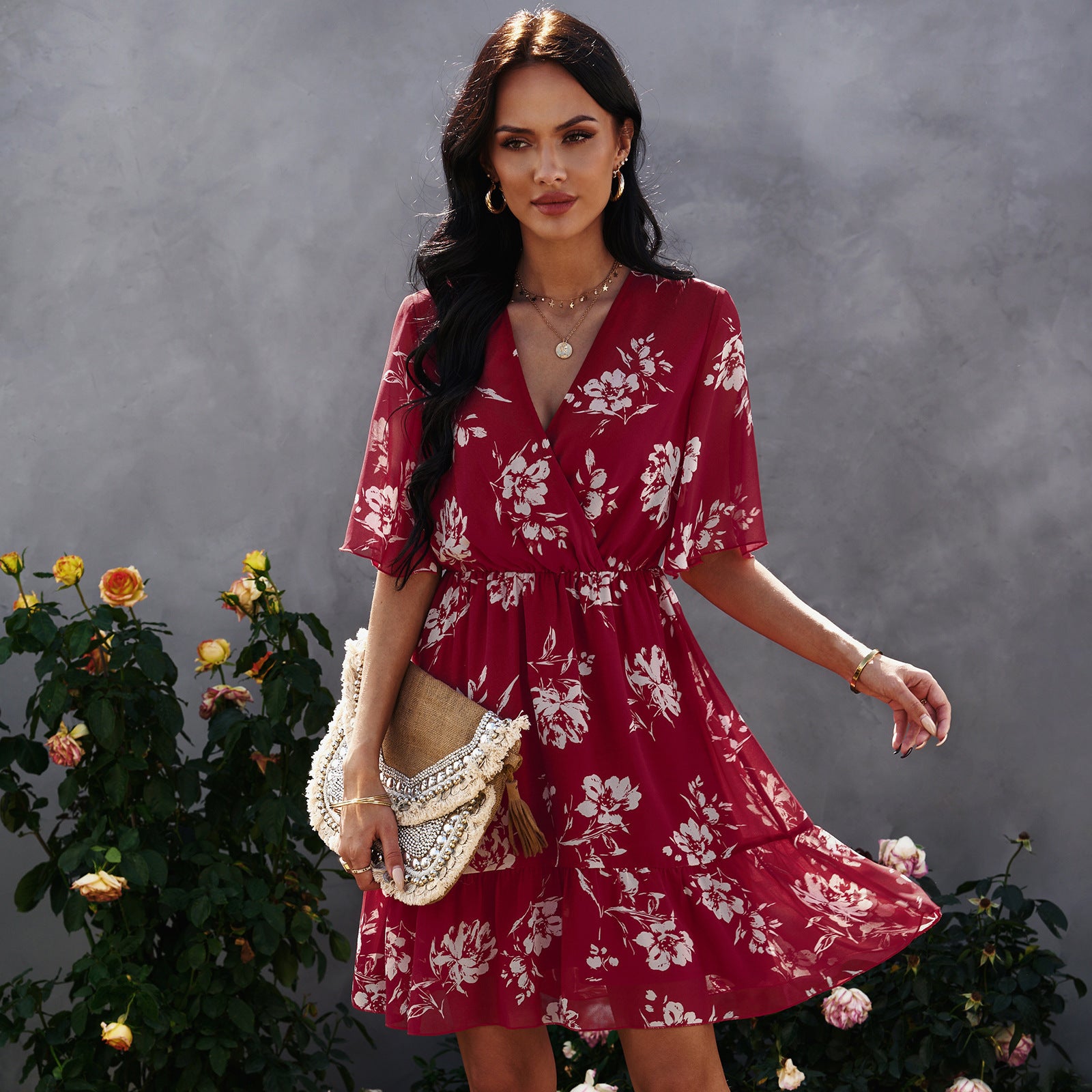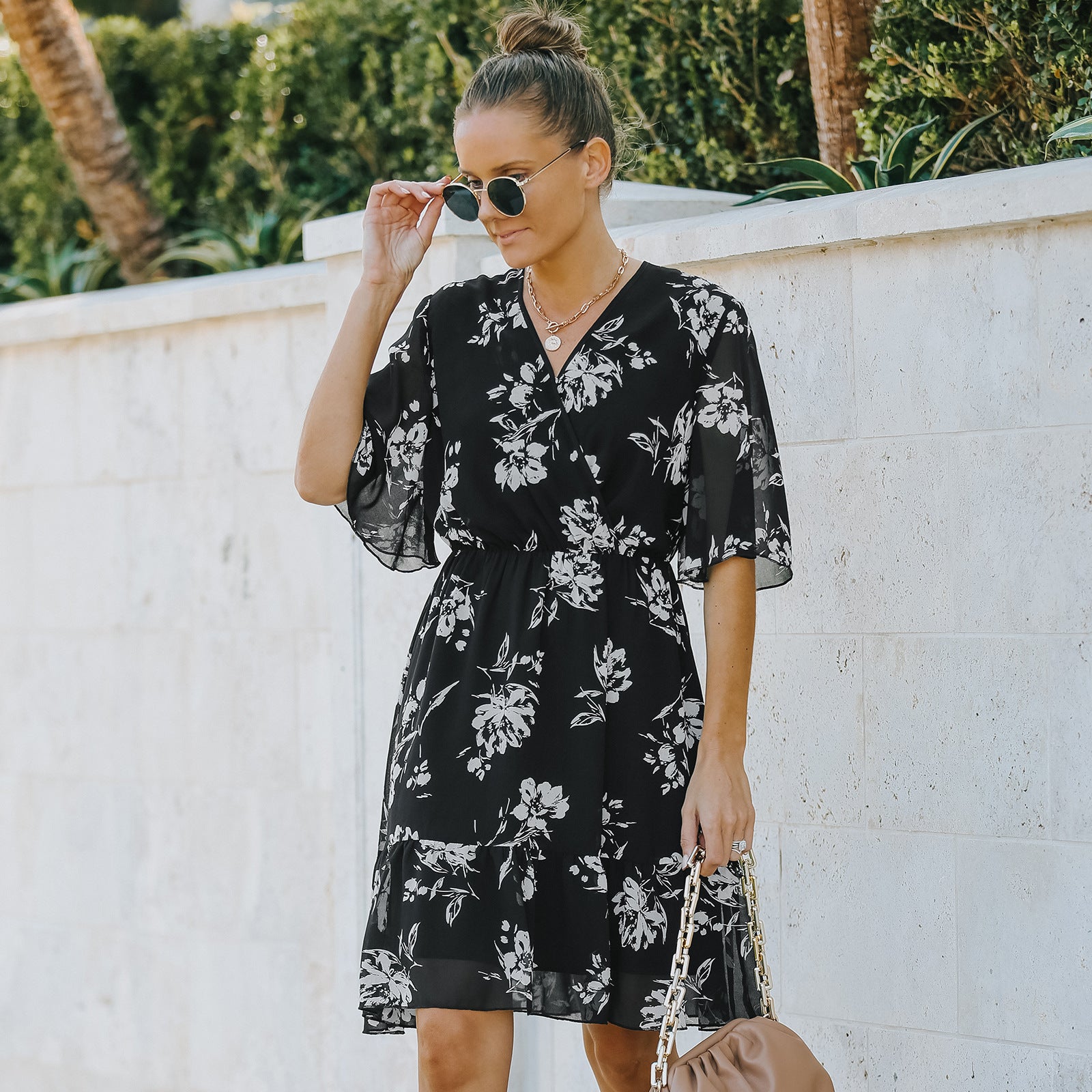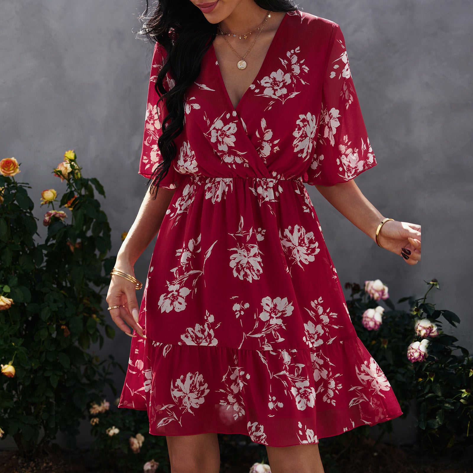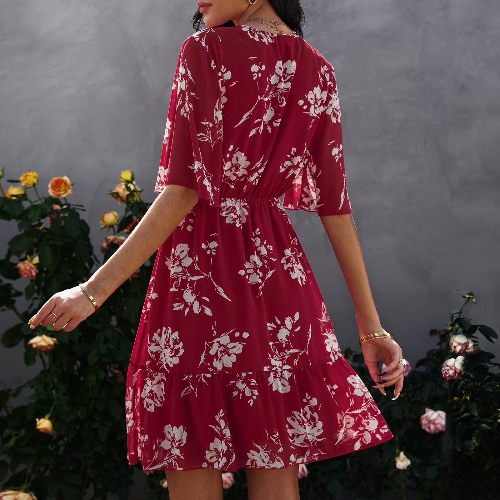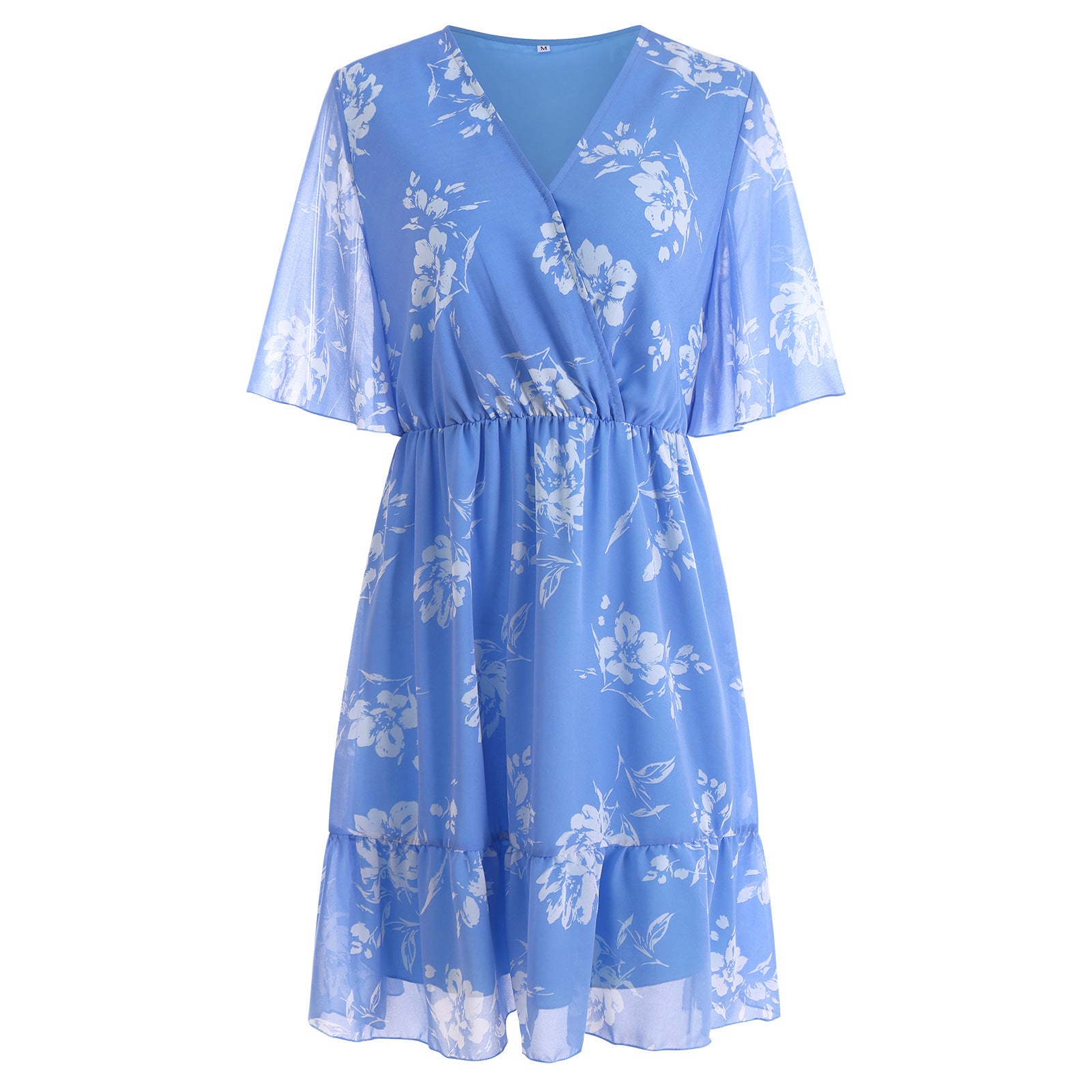 Floral chiffon dress with ruffles and V-neck