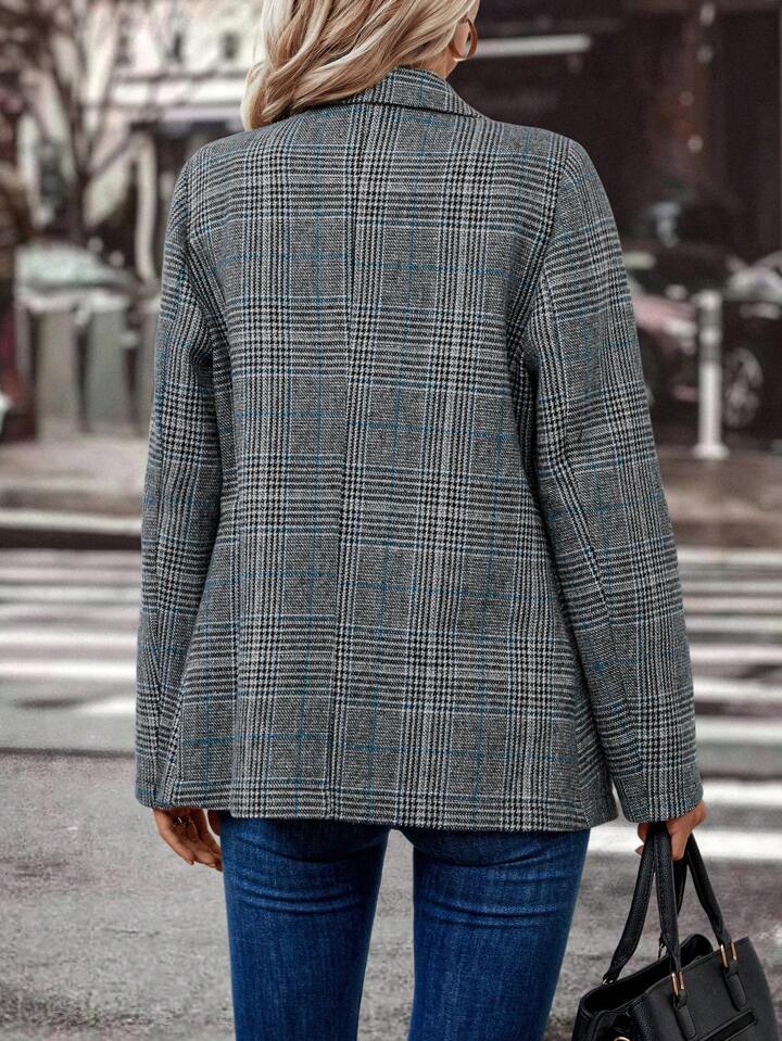 This outfit combines refinement and simplicity with a neat cut and classic patterned fabric. The structured blazer adds a sophisticated yet comfortable touch, perfect for a chic-casual look. Its timeless design makes it a versatile piece that works for any occasion.